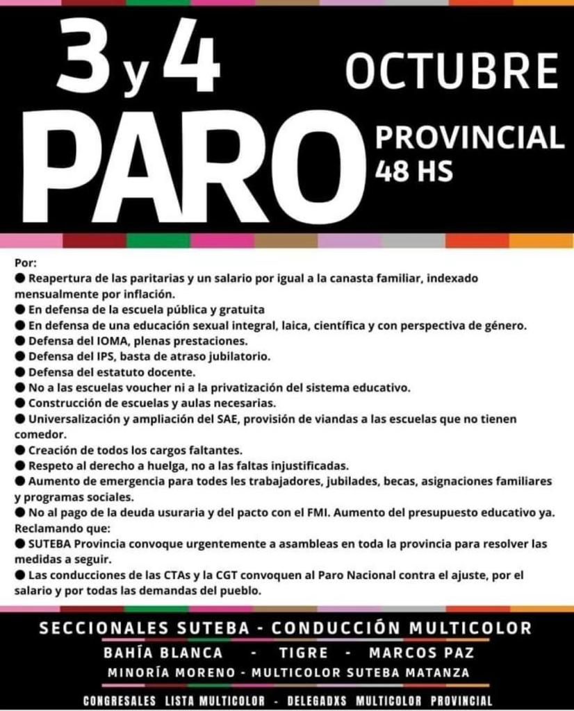 En tanto, desde la Dirección General de Cultura y Educación de la provincia de Buenos Aires informaron que el paro anunciado por el Suteba disidente es ilegal por lo que descontarán los días a docentes y auxiliares que no puedan justificar las inasistencias de los días 3 y 4 de octubre.