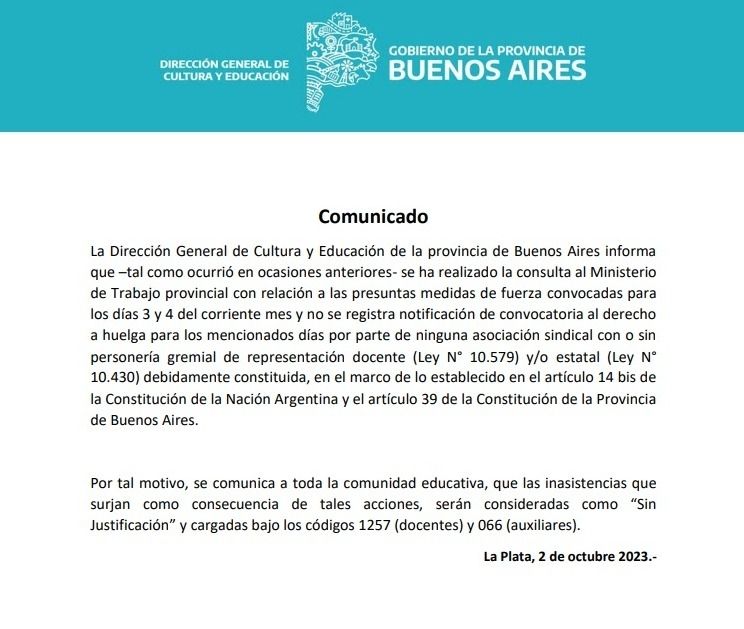 El organismo de educación bonaerense, comunicó que en el Ministerio de Trabajo provincial “no se registra notificación de convocatoria al derecho a huelga para los mencionados días por parte de ninguna asociación sindical con o sin personería gremial de representación docente (Ley N° 10.579) y/o estatal (Ley N° 10.430) debidamente constituida, en el marco de lo establecido en el artículo 14 bis de la Constitución de la Nación Argentina y el artículo 39 de la Constitución de la Provincia de Buenos Aires”. Por lo que las inasistencias que surjan como consecuencia de “acciones gremiales” serán consideradas como “Sin Justificación” y cargadas con el código 1257 a los docentes y 066 a auxiliares.