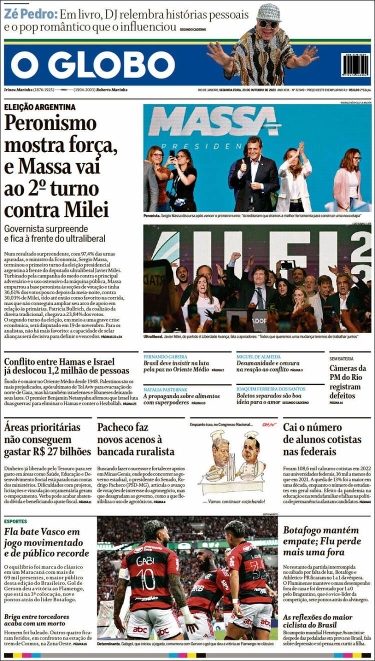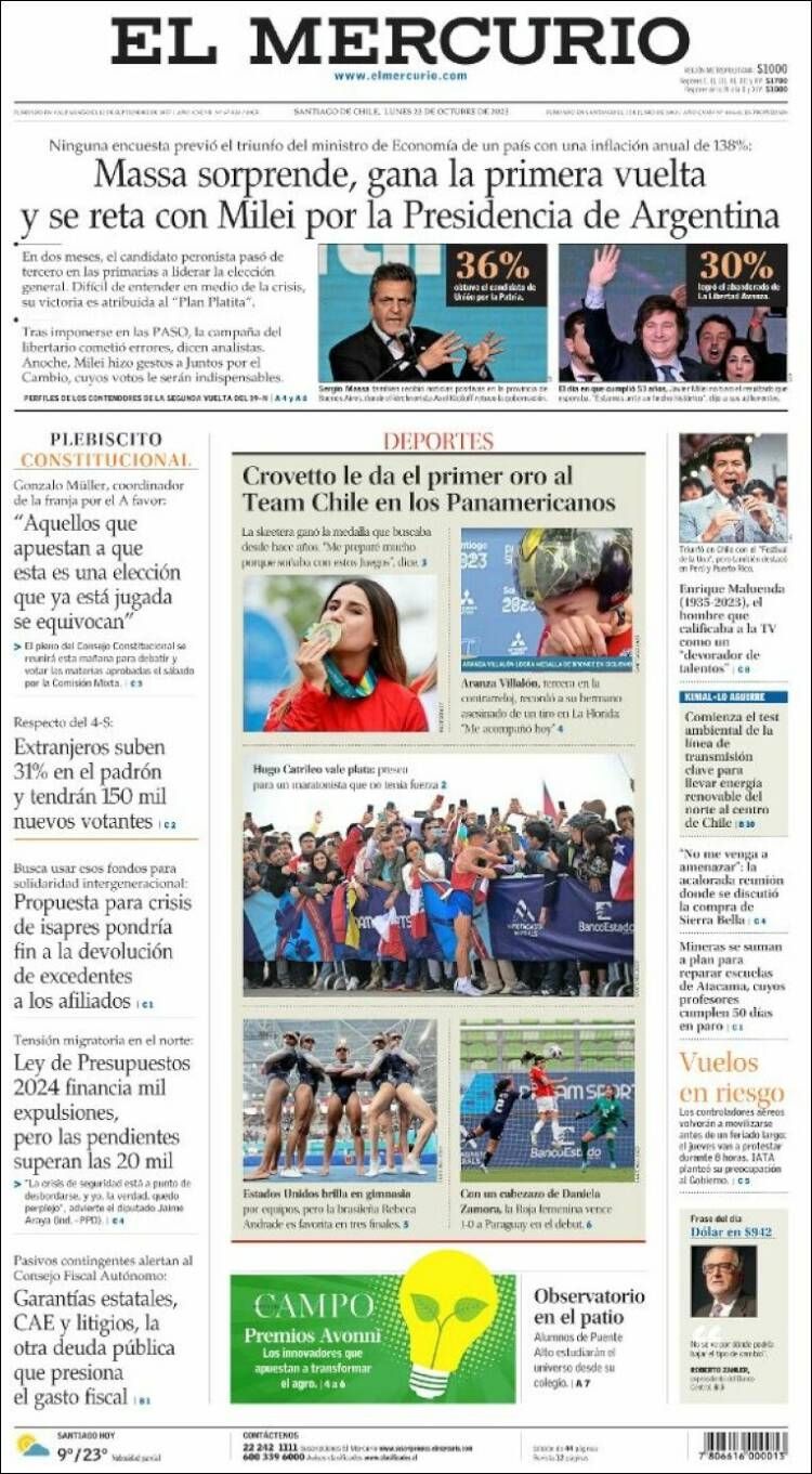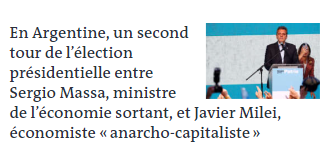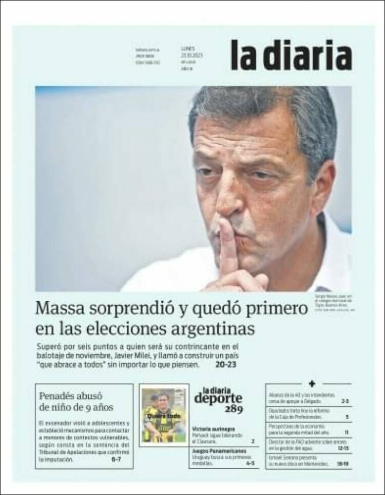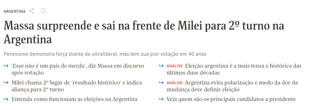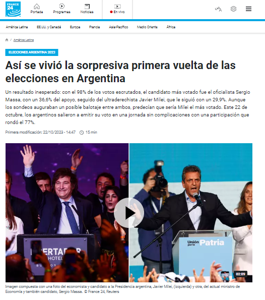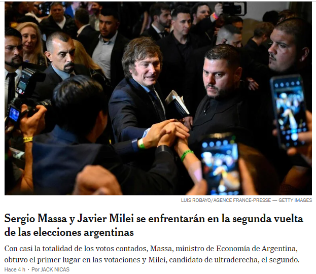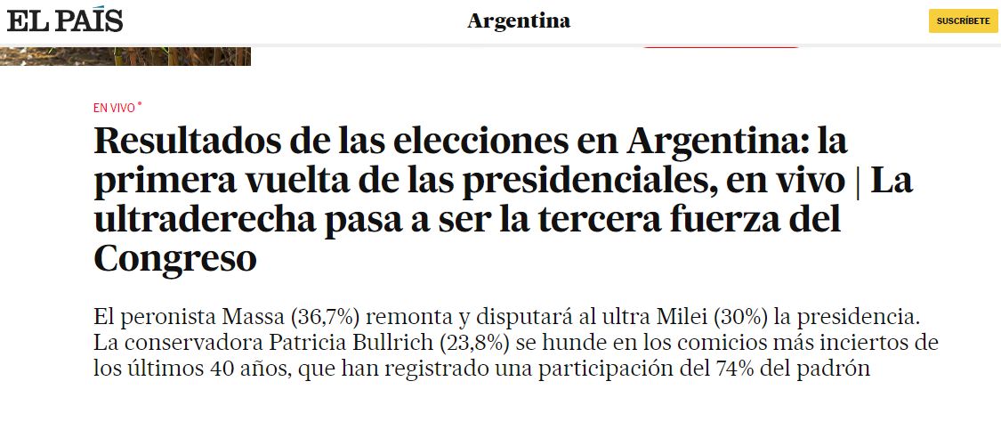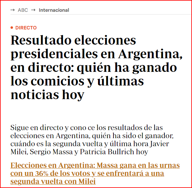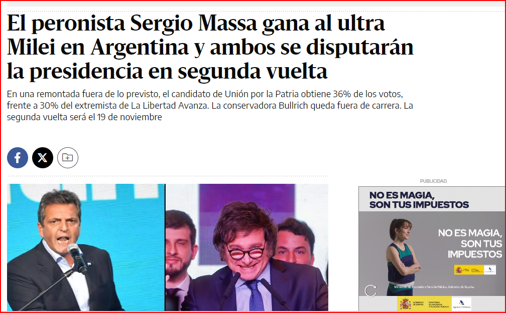 Más tarde, pasada la medianoche y en las primeras horas de la mañana, en los portales de los principales diarios de Europa comenzaron a leerse las repercusiones de las elecciones presidenciales. Era previsible que hubiera balotaje no sólo por el funcionamiento del sistema electoral de Argentina sino también porque las tres principales fuerzas habían tenido performances similares en las PASO. Pero nadie esperaba que el ministro de Economía lograra posicionarse en el primer lugar y esa fue la sorpresa sobre la que hicieron foco los medios.