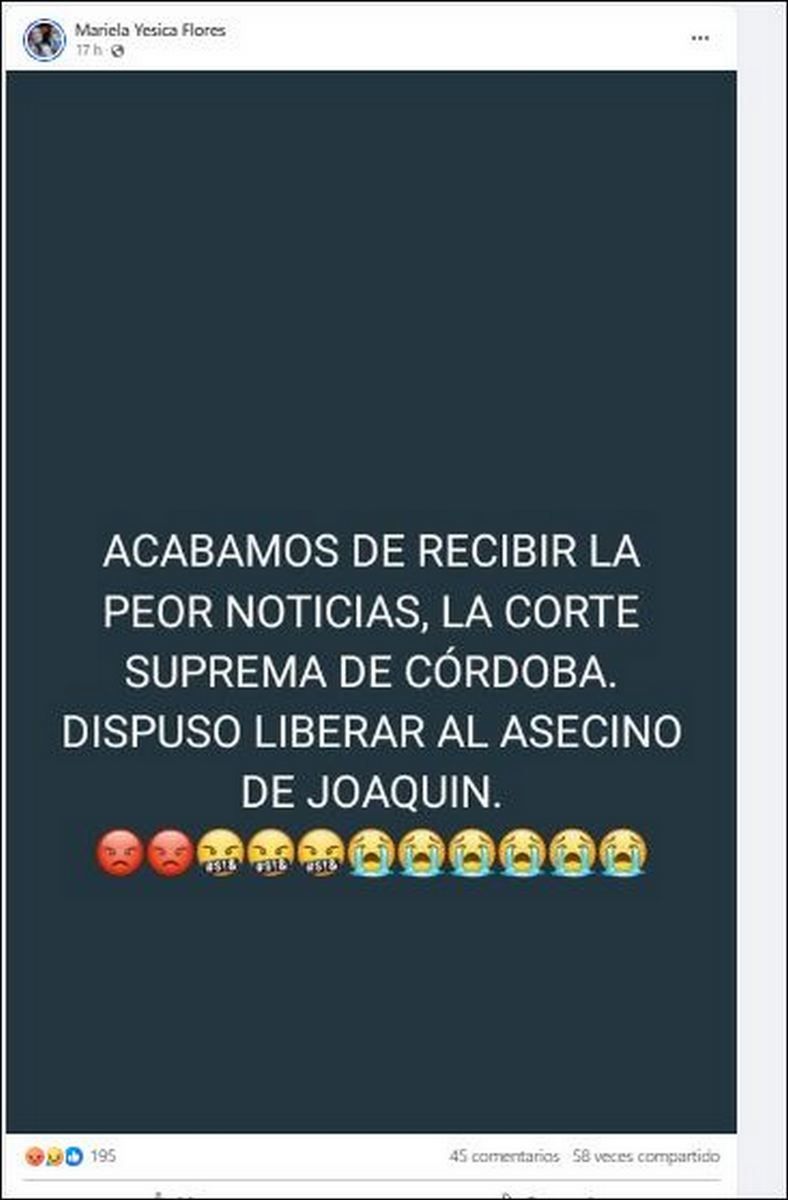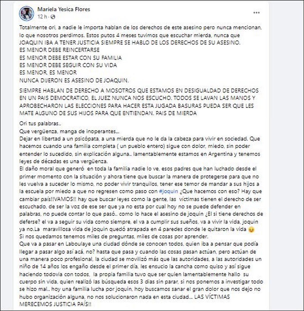 "Hablan de los derechos de este asesino pero nunca mencionan lo que nosotros perdimos. Estos putos cuatro meses tuvimos que escuchar mierda. Nunca que JOAQUIN IBA A TENER JUSTICIA, SIEMPRE SE HABLO DE LOS DERECHOS DE SU ASESINO. "ES MENOR DEBE REINCERTARSE" (sic); "ES MENOR DEBE ESTAR CON SU FAMILIA"; "ES MENOR DEBE SEGUIR CON SU VIDA"; "ES MENOR, ES MENOR"; "NUNCA DIJERON ES EL ASESINO DE JOAQUIN", posteó la mamá.