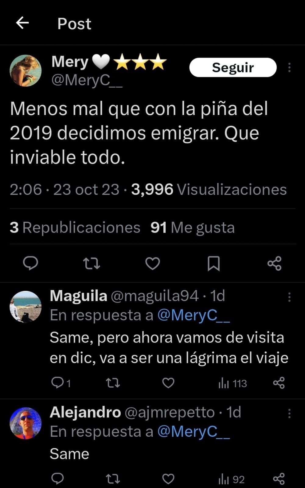 “Menos mal que con la piña del 2019 decidimos emigrar. Qué inviable todo” coincidió @MeryC desde Madrid.