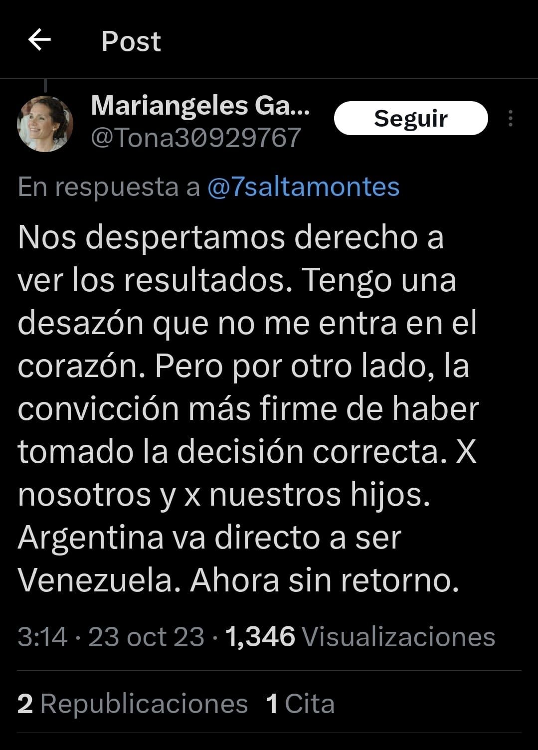 “Nos despertamos derecho a ver los resultados. Tengo una desazón que no me entra en el corazón. Pero por otro lado, la convicción más firme de haber tomado la decisión correcta. X nosotros y x nuestros hijos. Argentina va directo a ser Venezuela. Ahora sin retorno”, sentenció desde Italia @Tona30929767.