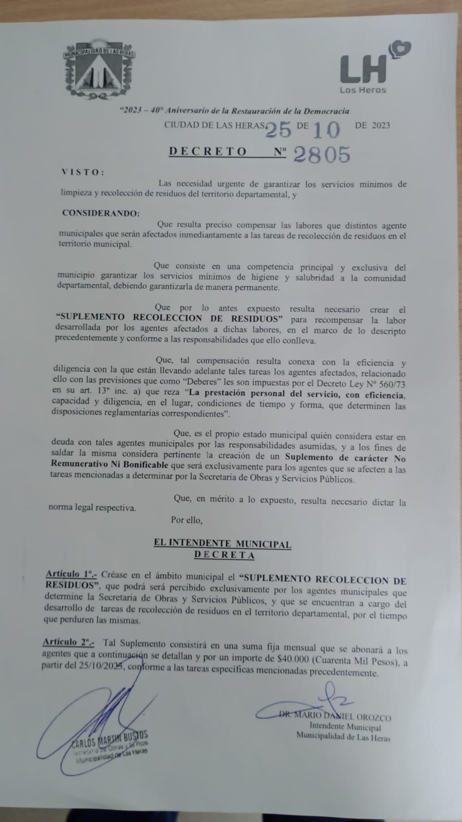 La Municipalidad de Las Heras otorgará un bono de $40.000 que podrá ser cobrado por los trabajadores afectados por la tarea de "recolección de residuos en el territorio municipal". La medida lleva la firma del Intendente de Las Heras, Daniel Orozco, y la del Secretario de Obras y Servicios Públicos del Municipio de Las Heras, Martín Bustos.