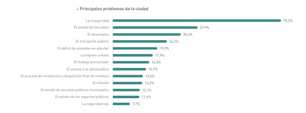La preocupación por la inseguridad se impuso en el sondeo, con un 75.2% de los consultados que la identificaron como el principal problema, seguido por el 37.9% que expresó su preocupación por el estado de las calles y el 30.4% por el desempleo.