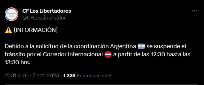 Desde Los Libertadores indicaron que el cierre durante una hora se da por pedido de la Coordinación del lado argentino. "Debido a la solicitud de la coordinación Argentina se suspende el tránsito por el Corredor Internacional a partir de las 12:30 hasta las 13:30 hrs", destacaron de forma oficial en sus redes sociales.