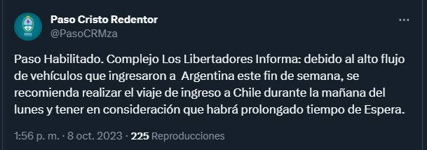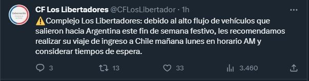 Considerando que los problemas pueden volver a registrarse, los complejos aduaneros de ambos países realizaron una particular recomendación durante este domingo. "Se recomienda realizar el viaje de ingreso a Chile durante la mañana del lunes y tener en consideración que habrá prolongado tiempo de espera", señalaron desde Argentina, en tanto, los chilenos sumaron un comunicado con el mismo consejo.