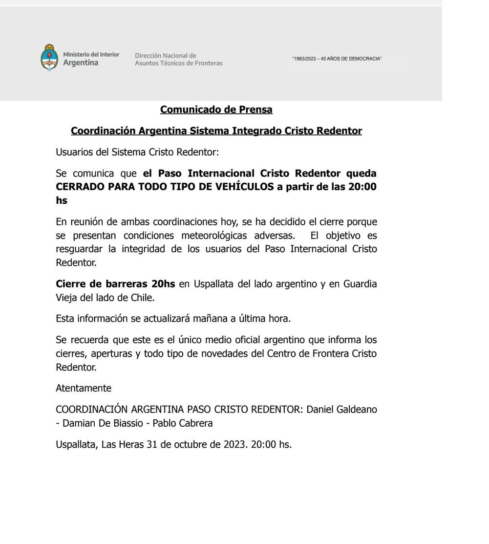 Qué probabilidades hay de que el Paso Internacional Cristo Redentor se habilite este miércoles