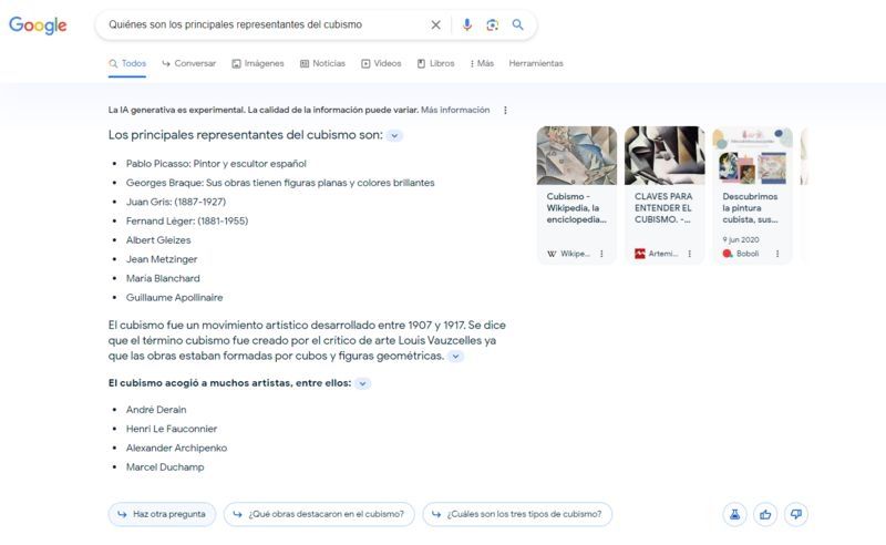 Así, por ejemplo, en una consulta sobre quiénes son los principales representantes del cubismo, esta herramienta hace una lista de los principales pintores de esta corriente, un resumen de qué es el cubismo, imágenes de algunas obras y sugerencias de preguntas relacionadas.