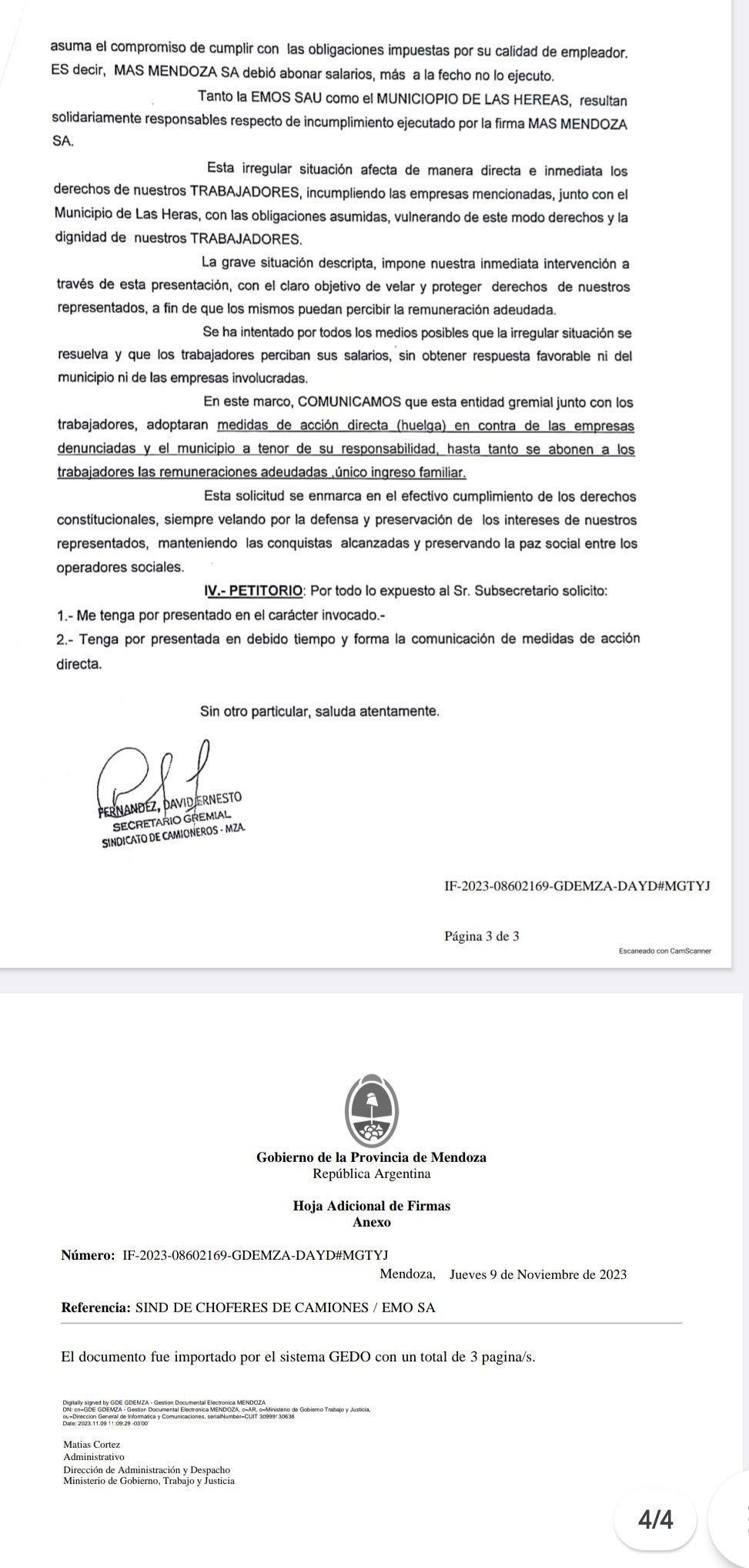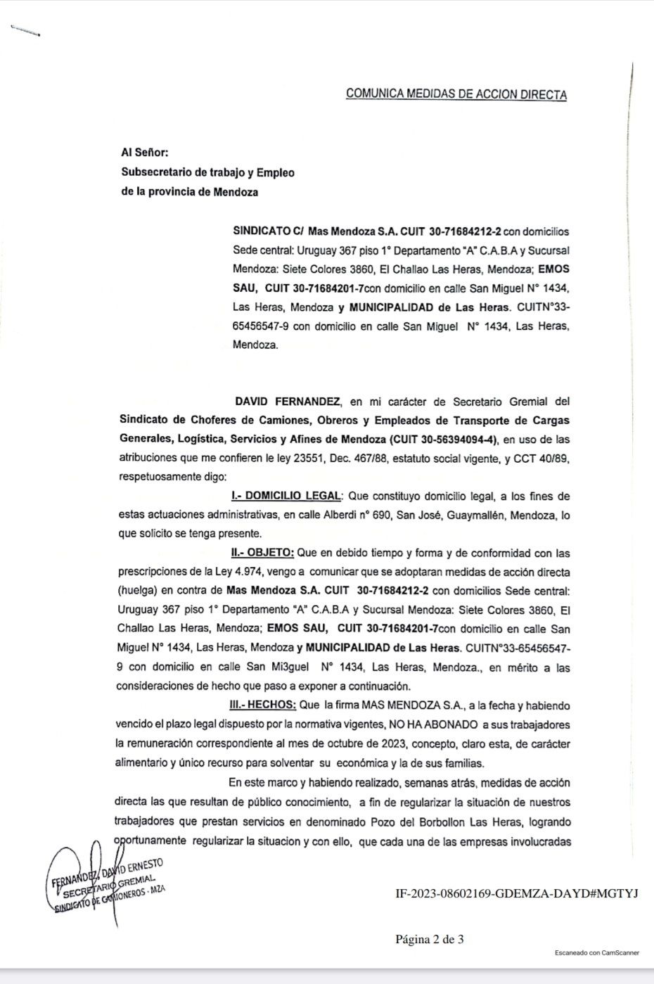 "Comunico que se adoptarán medidas de acción directa (huelga) a fin de regularizar la situación de nuestros trabajadores que prestan servicios en denominado Pozo del Borbollón, Las Heras, logran oportunamente regularizar la situación y con ello, que cada una de las empresas involucradas asuma el compromiso de cumplir con las obligaciones impuestas por su calidad de empleador", manifiesta el comunicado.
