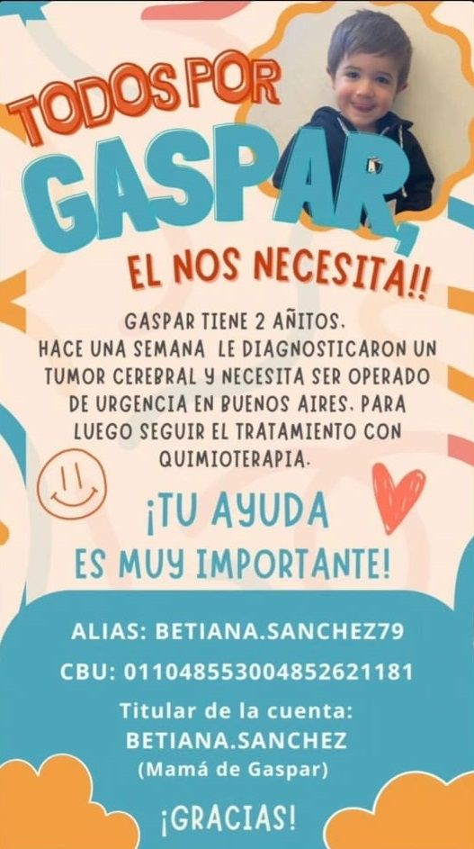 Todo empezó hace una semana cuando a Gaspar los médicos le diagnosticaron un tumor cerebral. La operación debe realizarse en Buenos Aires y en esta ciudad también deberá continuar el tratamiento de quimioterapia.