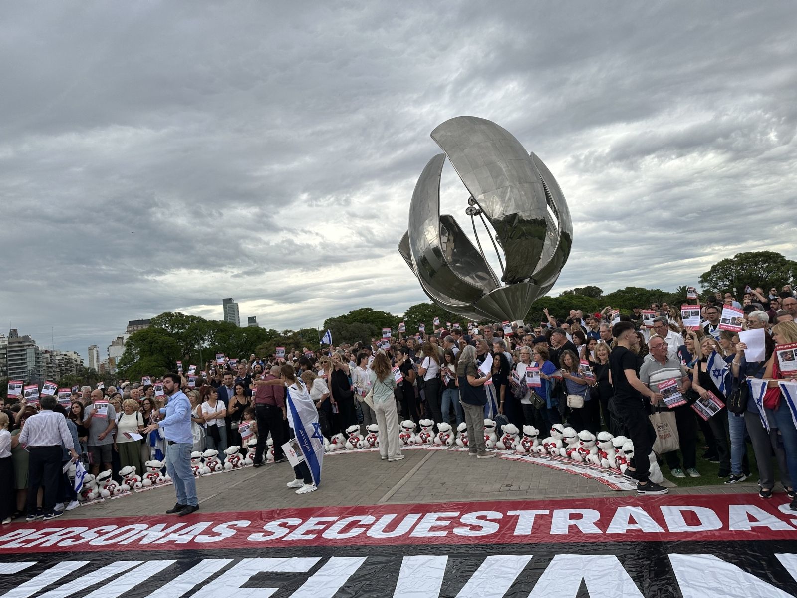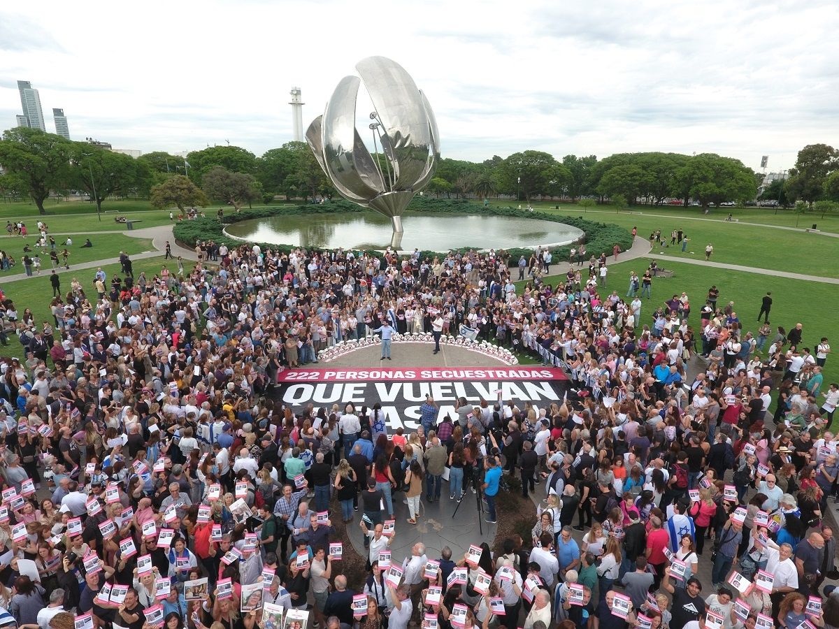Minutos antes de las 17:00 horas, una multitud ya se encontraba frente a la Floralis Genérica, la escultura metálica ubicada en el barrio porteño de Recoleta. Los manifestantes destacaron que “el antisemitismo es inaceptable” y reclamaron que "el gobierno argentino actúe para que los liberen”. Unos 40 minutos después caminaron media cuadra hasta las escalinatas de la facultad.