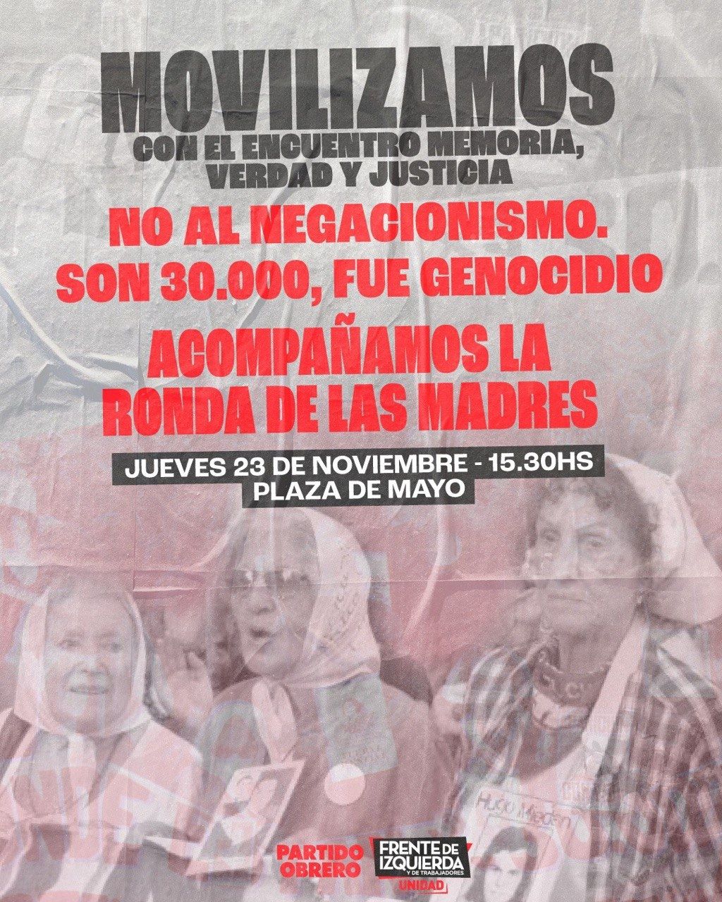 "Al ajuste que se viene claramente debemos enfrentarlo con la organización y lucha de los trabajadores. Vamos a movilizarnos a Plaza de Mayo donde, como todos los jueves hace más de cuarenta años, se reúnen las Madres de Plaza de Mayo y vamos a abrazarlas", destacó el dirigente de la organización, Eduardo Belliboni.