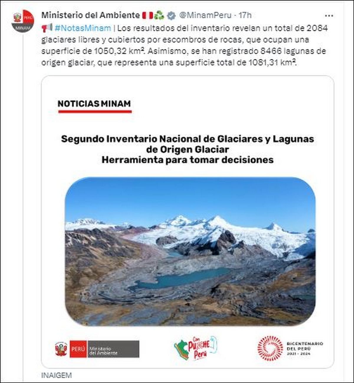 Cada 5 años se actualiza el Inventario Nacional de Glaciares y Lagunas de Origen Glaciar, a fin de proporcionar información del estado actual de esos territorios: cantidad, superficie, ubicación y principales características físicas y morfológicas de los glaciares y lagunas de todo el país; ello contribuye a la gestión integrada de las cuencas en el marco de la Política Nacional del Ambiente.