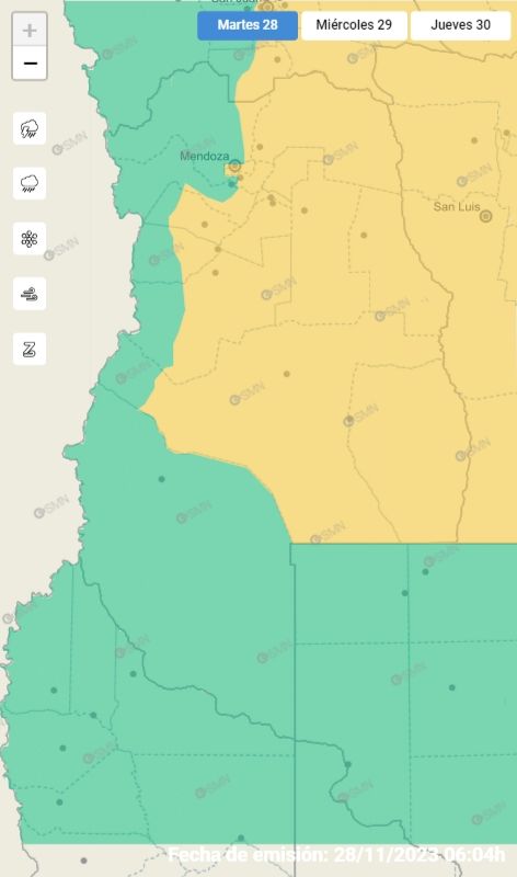 El Servicio Meteorológico Nacional (SMN) anticipó, a través de su página oficial, que este martes se registrará leve descenso de la temperatura con una máxima cercana a los 30°. El sistema nacional emitió alerta meteorológica amarilla por tormentas que pueden provocar daños o interrupción de actividades en la provincia de Mendoza.