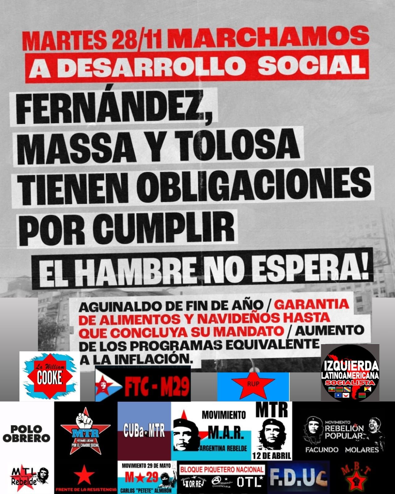 También convocaron el Movimiento Teresa Rodríguez (MTR), el Movimiento 29 de mayo, el Movimiento Argentina Rebelde, el Bloque Piquetero Nacional, el Movimiento Rebelión Popular, el Frente de Desocupados Unidos y el Movimiento Barrial de los Trabajadores.