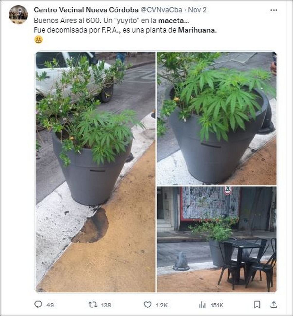 La Fuerza Policial Antinarcotráfico (FPA) secuestró en la tarde del jueves una planta de marihuana que había crecido en una maceta ubicada en la SuperManzana ubicada en un barrio céntrico. La misma estaba ubicada en uno de los espacios públicos creados por el municipio de la ciudad de Córdoba.
