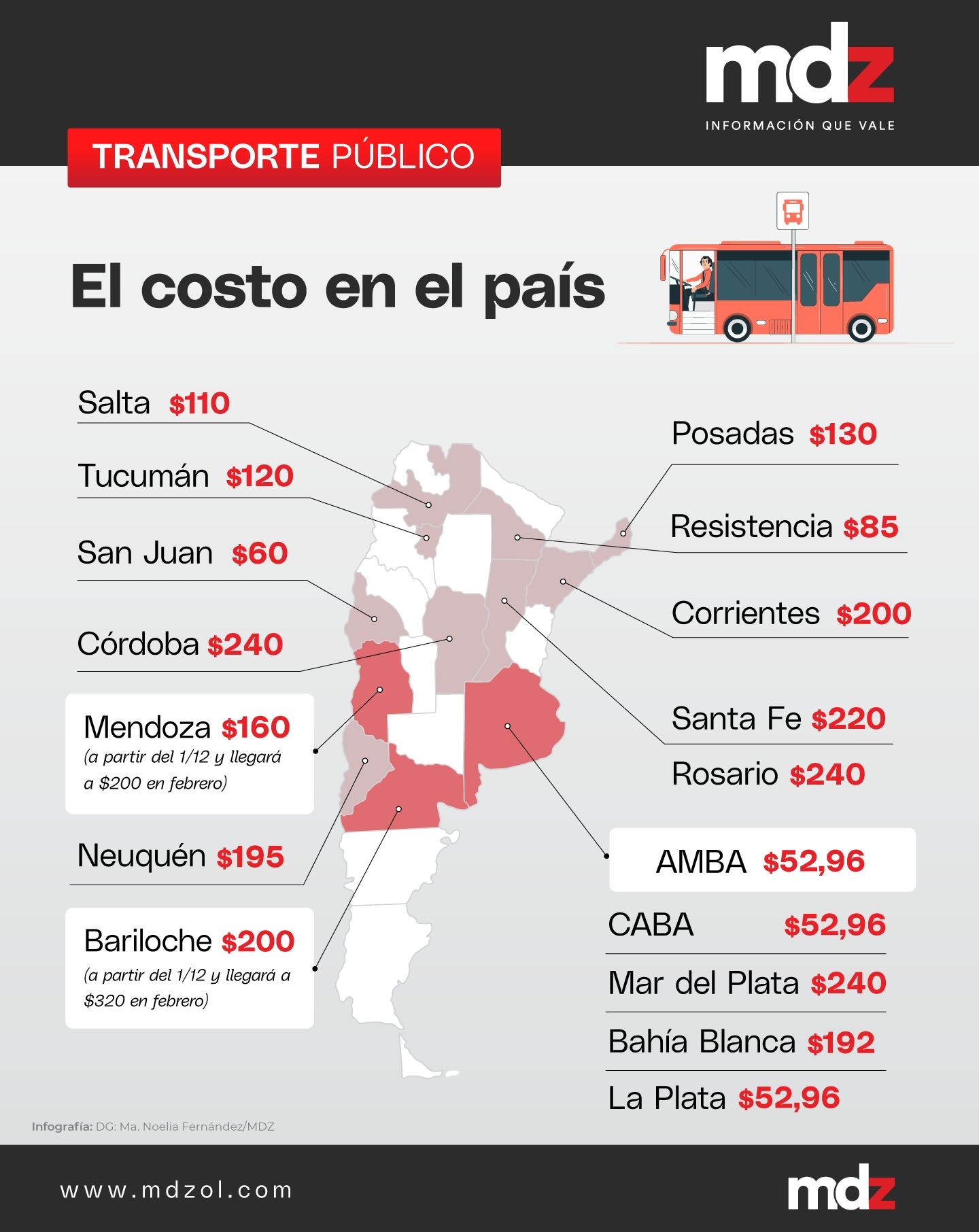 Con este nuevo precio, Bariloche será la ciudad con el transporte más caro del país, seguida por Mendoza que, a partir de febrero, tendrá la tarifa en los $200. Luego estarán Córdoba, Rosario y Mar del Plata, seguidas por Neuquén, Santa Fe y Bahía Blanca, donde cuesta más del triple que en el AMBA.