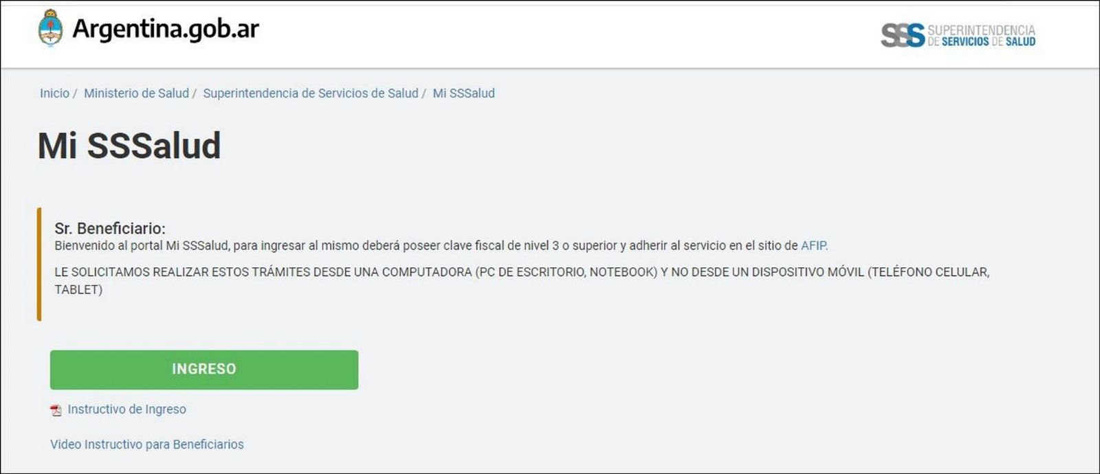 - Una vez que se tenga Clave Fiscal, se podrá ingresar al portal https://www.sssalud.gob.ar/misssalud/