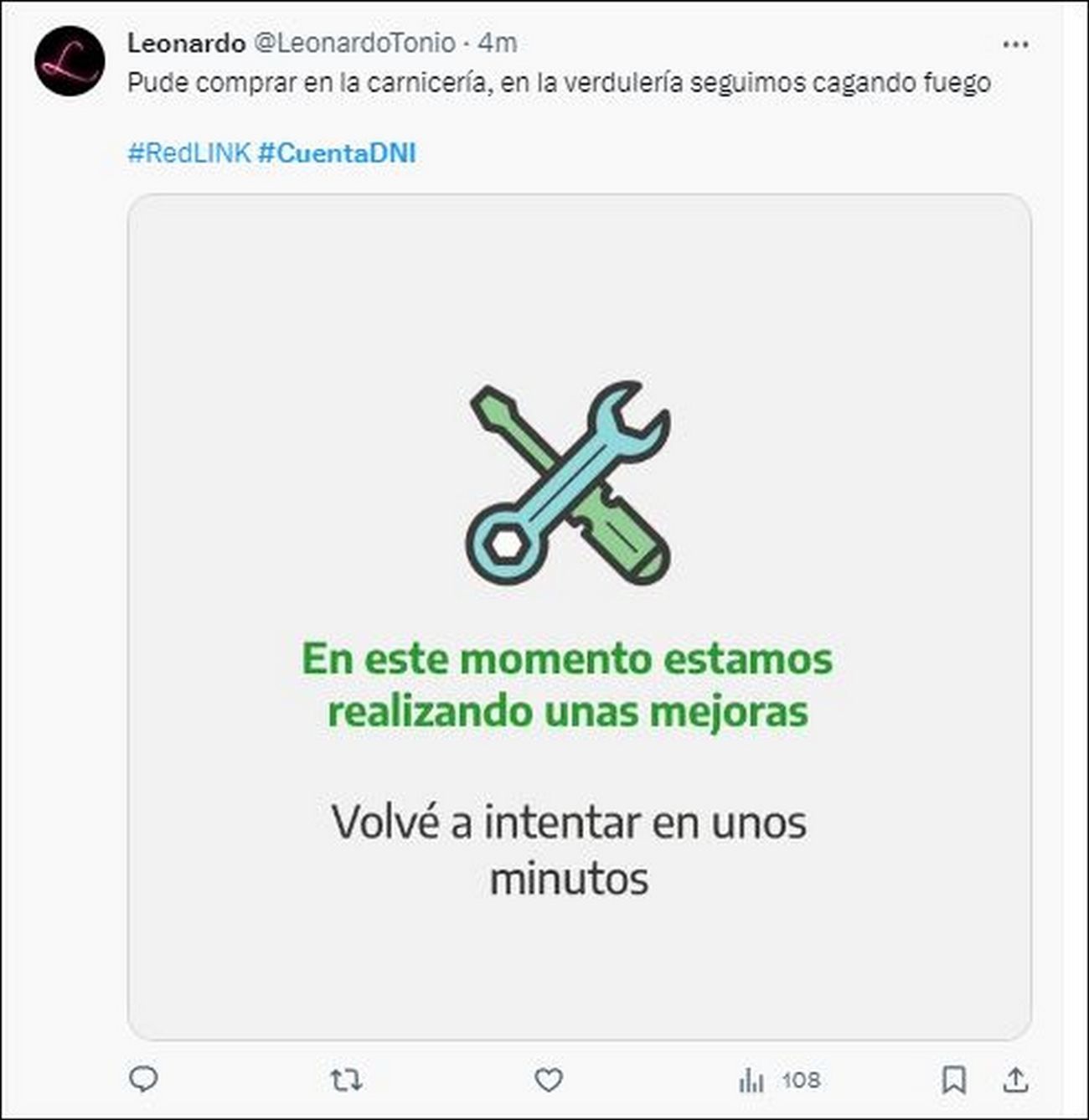 Al mediodía, el hashtag #CuentaDNI ya era tendencia en "X" y los reclamos se centraban en que la red Banelco sí funciona pero la estatal Link era que la presentaba fallas. La única forma de realizar pagos en comercios era mediante el efectivo o a través de transferencias mediante Mercado Pago. El problema es a nivel nacional ya que en varias localidades los usuarios presentan inconvenientes para concretar las transacciones y acceder a su dinero.
