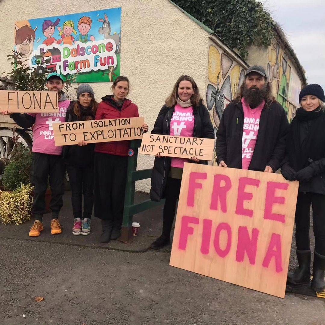Desde Animal Rising se movilizan para generar conciencia en la sociedad y así evitar que FIona se convierta en un espectáculo. "Ayer siete de nuestros seguidores permanecieron en silencio afuera de Dalscone Farm Fun esperando la llegada de Fiona con pancartas", escribieron en sus redes sociales para compartir lo que estaba ocurriendo.