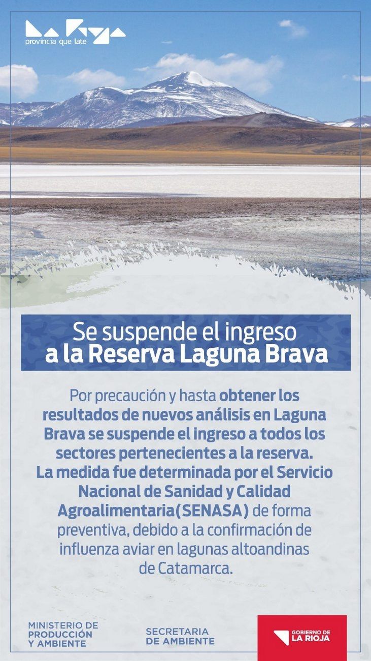 La medida tiene por objeto proteger tanto a la fauna local como a posibles visitantes y turistas, ya que se ha confirmado un foco de la enfermedad en especies de flamencos en Las Peñas, provincia de Catamarca, a poca distancia de Laguna Brava. Solo el personal capacitado y autorizado podrá tratar los cadáveres de aves en la zona, mientras se espera un segundo diagnóstico del laboratorio de Senasa en Buenos Aires.