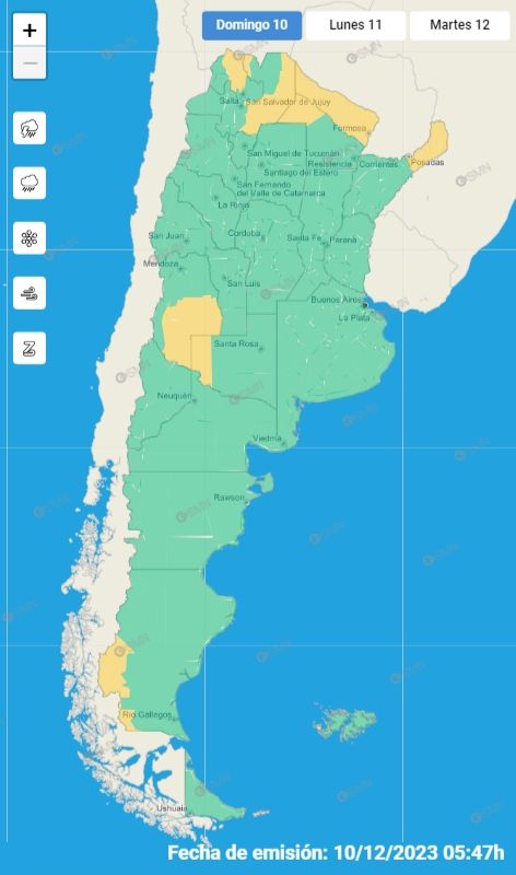 Para este domingo, el Servicio Meteorológico Nacional ha establecido una alerta amarilla en el sur provincial por vientos fuertes. Según la entidad, Malargüe, General Alvear y San Rafael serán "afectados por vientos del sector norte con velocidades entre 40 y 55 km/h, y ráfagas que pueden superar los 70 km/h".