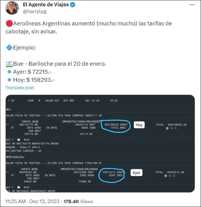 Tomando el valor de los vuelos que ofrecen Aerolíneas Argentinas, Flybondi y Jetsmart, subieron a partir de las medidas anunciadas; es decir, entre estos últimos tres días. Por ejemplo, la cuenta de X (Twitter) El Agente de Viajes mostró que las tarifas de cabotaje de Buenos Aires a Bariloche para el 20 de enero costaban el lunes $72.215, mientras que el miércoles aumentaron a $158.293.
