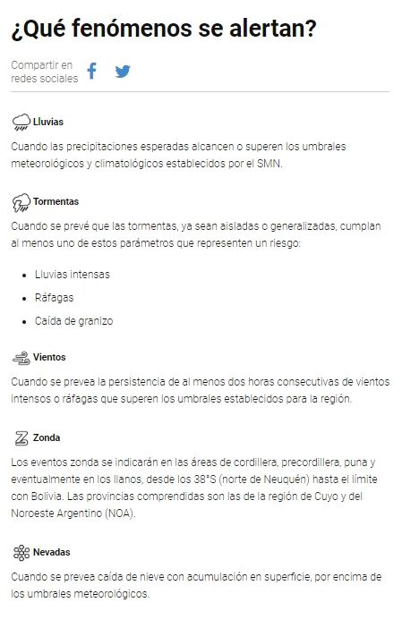 Para establecer el nivel de alerta, se tienen en cuenta los siguientes parámetros y criterios: intensidad del fenómeno, basada en umbrales meteorológicos; factor adverso, situación no necesariamente meteorológica que puede aumentar el impacto del fenómeno meteorológico (saturación de suelo, movilización de población, sequía, entre otros); y probabilidad de ocurrencia de un evento meteorológico que representa una amenaza. Se considera también la incertidumbre propia de los pronósticos. En general, cuanto más lejano sea el plazo del pronóstico, mayor será la incertidumbre del evento. Las alertas y advertencias se actualizan todos los días a las 6 y a las 18 horas, pero, si la situación meteorológica lo requiere, se realizan actualizaciones adicionales fuera de dichos horarios.