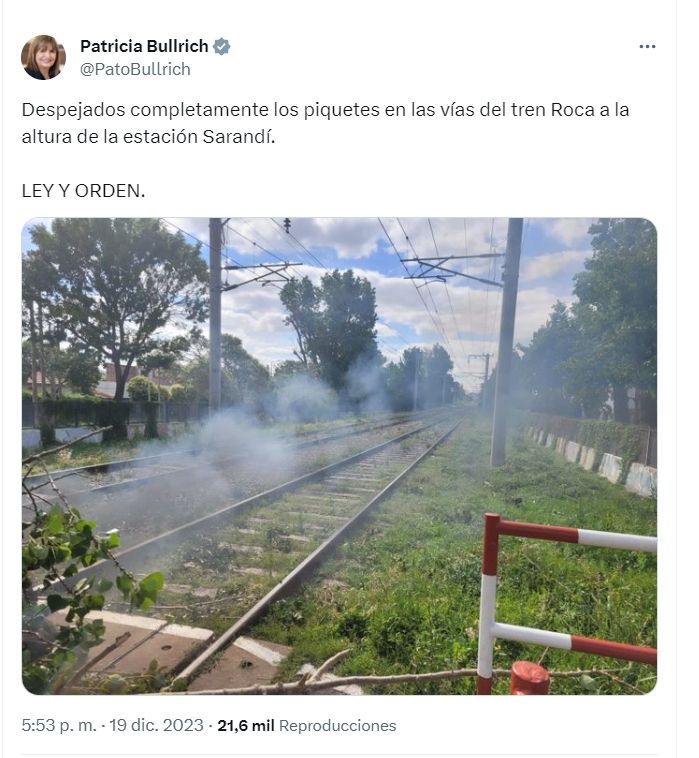 "Despejados completamente los piquetes en las vías del Tren Roca a la altura de estación Sarandí", escribió la ministra acompañando su posteo con una foto de las vías del tren y la frase: "Ley y orden".