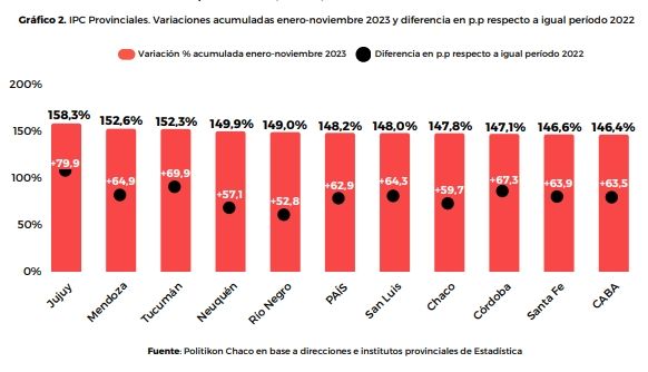 En ese contexto, tres distritos registraron alzas del IPC superiores al total país relevado por el Indec en noviembre con Jujuy a la cabeza (14,2%), seguida por Mendoza (13,9%) y Córdoba (12,9%). Por el contrario, en Chaco se vio el incremento más leve del mes (11,2%).