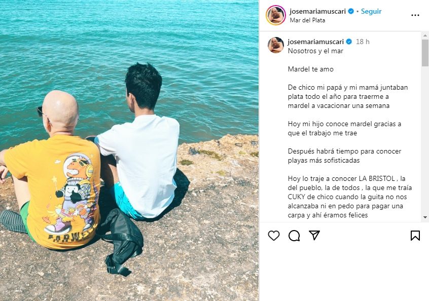 Antes de conceder la entrevista a este medio, Muscari compartió en su cuenta de Instagram una foto junto a Lucio mirando el mar y escribió: "Nosotros y el mar. De chico mi papá y mi mamá juntaban plata todo el año para traerme a Mardel a vacacionar una semana. Hoy mi hijo conoce Mardel gracias a que el trabajo me trae".