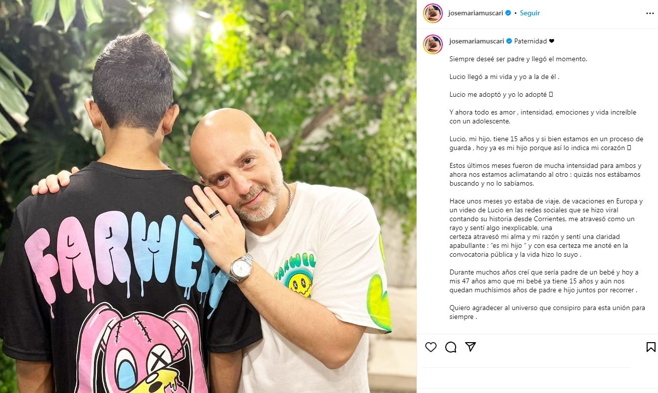 "Paternidad. Siempre deseé ser padre y llegó el momento. Lucio llegó a mi vida y yo a la de él. Lucio me adoptó y yo lo adopté. Y ahora todo es amor, intensidad, emociones y vida increíble con un adolescente. Lucio, mi hijo, tiene 15 años y si bien estamos en un proceso de guarda, hoy ya es mi hijo porque así lo indica mi corazón. Estos últimos meses fueron de mucha intensidad para ambos y ahora nos estamos aclimatando al otro quizás nos estábamos buscando y no lo sabíamos", empieza diciendo su publicación.