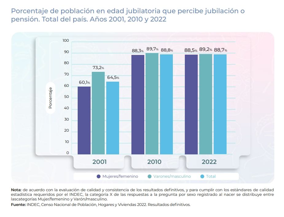 "Entre 2001 y 2022 se observa un incremento sostenido en la población en edad jubilatoria que percibe jubilación o pensión, especialmente entre las mujeres. Mientras que el Censo 2001 registró que 6 de cada 10 mujeres en edad jubilatoria accedían a una jubilación o pensión, el Censo 2022 relevó que 9 de cada 10 mujeres estaban en esa condición, un valor similar al de 2010. Esto se explica principalmente por la implementación de sucesivos regímenes de moratoria que permiten completar los aportes jubilatorios mediante un plan de pagos que se descuenta de los haberes percibidos", expresa el informe sobre Salud y Previsión Social que surge del Censo 2022.