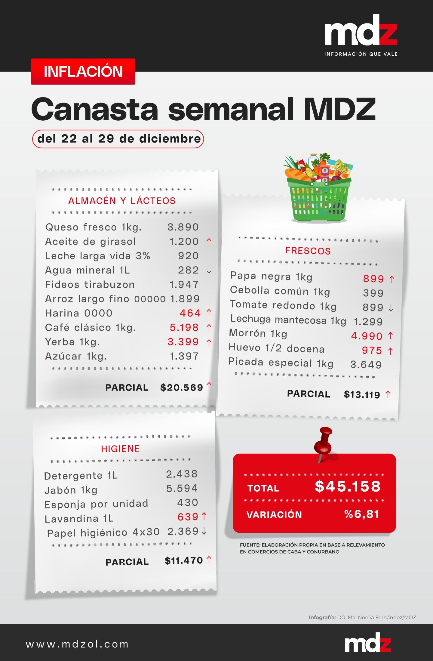 El año cierra con fuertes aumentos en productos de la canasta básica, marcando una nueva aceleración en los aumentos de la canasta semanal de MDZ. Según el relevamiento, el aumento del total fue de 6,81% en los últimos siete días, marcando un mayor incremento en los productos de almacén y lácteos, con un 12,04%.