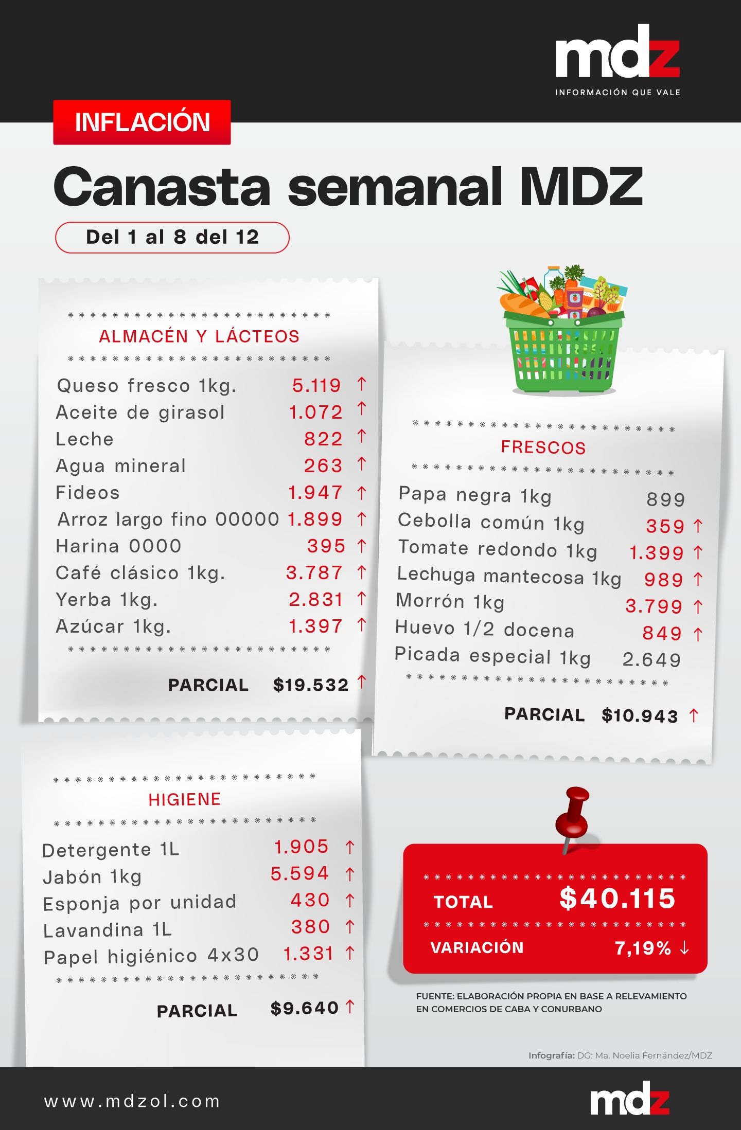 El costo total de la canasta fue de $40.115, un aumento en el total del 7,19%, número demasiado alto para solo una semana, aunque constante durante el último tiempo. En el ejercicio anterior la inflación había sido del 7,72% con respecto a la semana previa, lo que significa que hubo una mínima desaceleración en el incremento, pero preocupa la tendencia alcista de los precios de cara a la nueva administración.