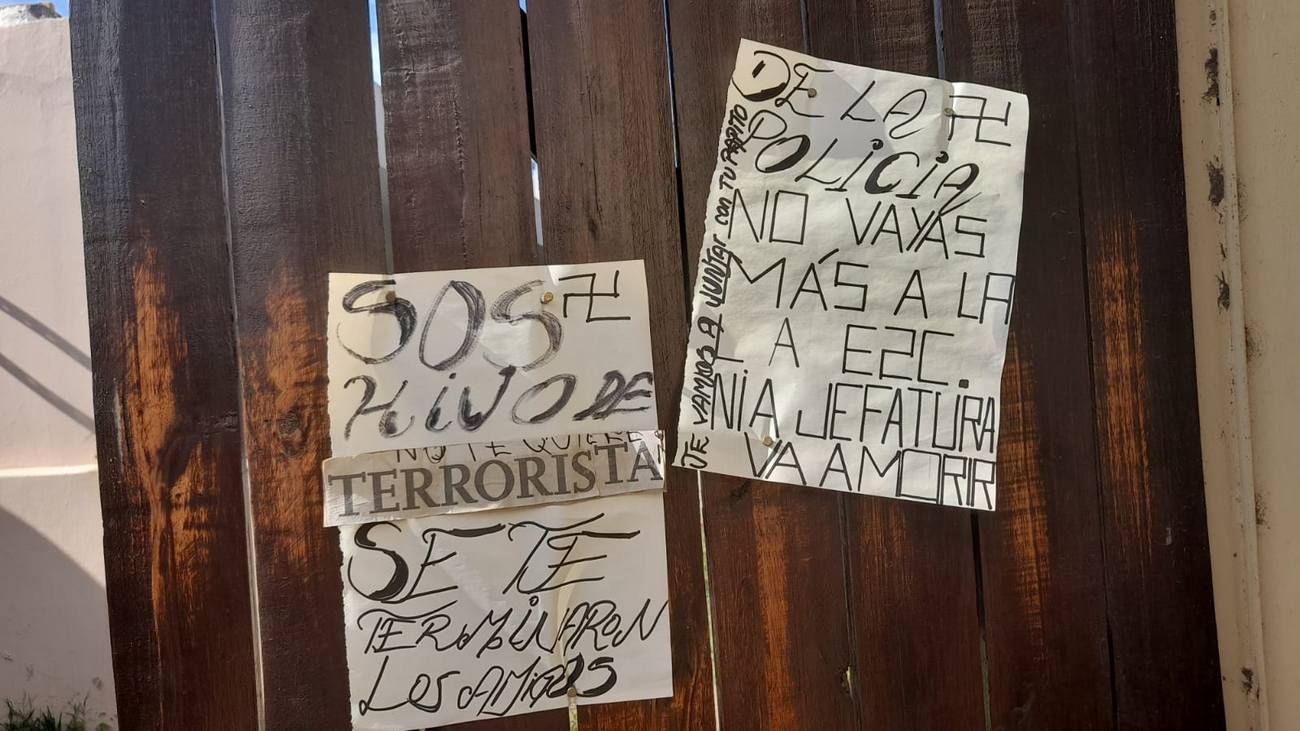 En los carteles donde además se incluyeron esvásticas puede leerse: "Sos hijo de terrorista. Se te terminaron los amigos de la Policía. No vayas más a la Esc. ni a Jefatura. Va a morir. Te vamos a juntar con tu papito".