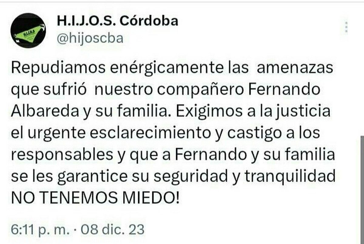 En tanto, desde la red social de H.I.J.O.S. Córdoba difundieron un mensaje de repudio y pidieron el esclarecimiento del hecho. "Repudiamos enérgicamente las amenazas que sufrió nuestro compañero Fernando Albareda y su familia. Exigimos a la justicia el urgente esclarecimiento y castigo a los responsables y que a Fernando y su familia se les garantice su seguridad y tranquilidad. NO TENEMOS MIEDO!".