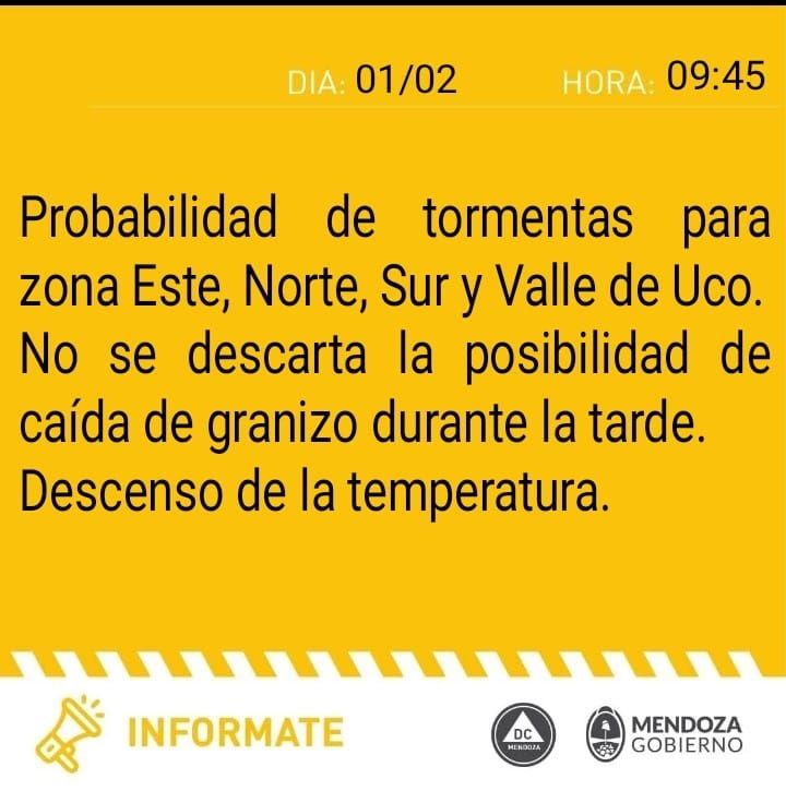 El comunicado de Defensa Civil expresa que se mantienen las condiciones de inestabilidad meteorológica con "probabilidad de tormentas para zona Este, Norte, Sur y Valle de Uco".