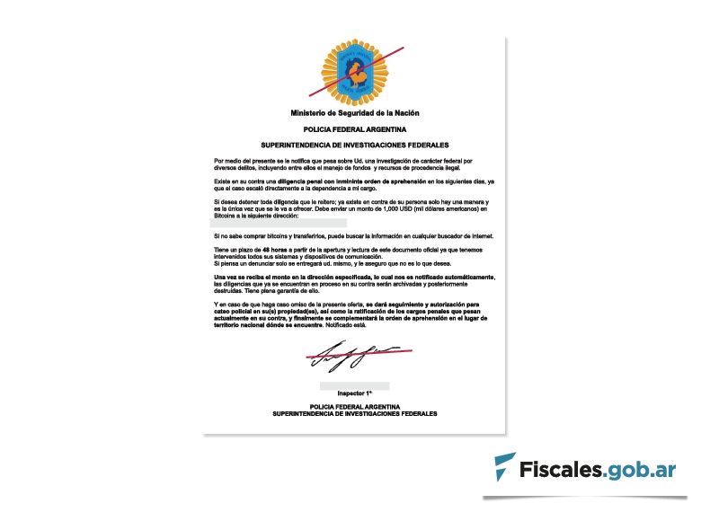 La Unidad Fiscal Especializada en Ciberdelincuencia (UFECI), a cargo del fiscal general Horacio Azzolín, alertó sobre una nueva modalidad de estafas a través de correos electrónicos enviados a nombre de la Policía Federal Argentina (PFA) o Interpol en los que se advierte a las víctimas que existe en su contra una investigación penal por "pornografía infantil" y "ciberpornografía", entre otros aspectos, y se las amenaza con una "inminente orden de aprehensión a raíz de una incautación informática por ciberinfiltración en sus computadoras".
