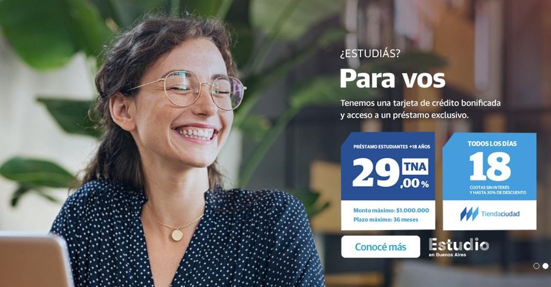 A su vez, para los estudiantes mayores de 18 años, el Ciudad tiene una propuesta de financiamiento integral que incluye préstamos a tasas promocionales, servicios bancarios específicos, beneficios y promociones exclusivas. Para la inclusión financiera de los estudiantes, el Ciudad brinda créditos que incorporan la figura del garante; son para amplios destinos, con una tasa fija promocional del 29% TNA, a un plazo de hasta 36 meses y un monto máximo a otorgar de $1.000.000 (para un monto de $100.000, la cuota inicial es de $4.769). Asimismo, los estudiantes pueden acceder a su propia tarjeta de crédito con renovación bonificada, que también admite la figura del garante, y cuenta con promociones especiales, tales como 18 cuotas sin interés y 30% de descuento para la compra de computadoras y artículos de tecnología.