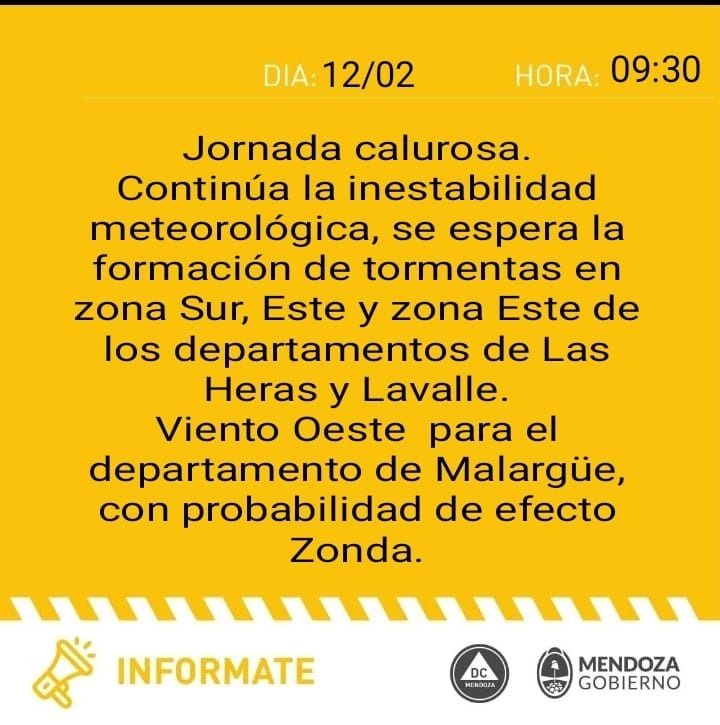 Según el organismo, a partir de las 14, Malargüe comenzará a sufrir de la circulación de viento oeste con intensidad leve a moderado, lo que provocará un efecto de Zonda. Está circulación de aire se mantendría hasta las 20.