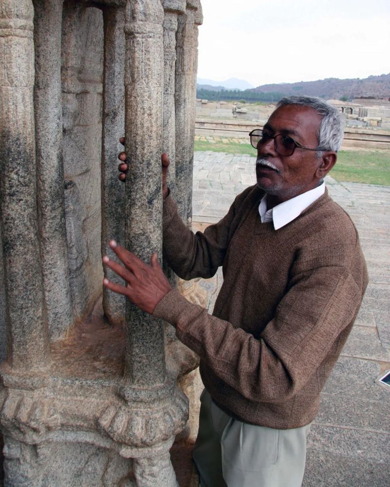 "En los viejos tiempos", dijo Manjunath, "los músicos solían 'tocar' estas esbeltas columnas con palos de sándalo o con los dedos, produciendo los sonidos de diferentes instrumentos".