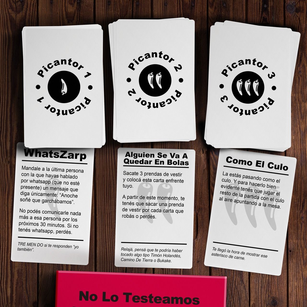 El “No lo testeamos ni un poco” en su versión “Picante” es un juego que, mediante cartas ofrece niveles de “Picantor 1, 2 y 3”. El objetivo es ganar haciendo que los demás pierdan. Las posibilidades son tan numerosas como creativas: desde jugar toda la partida desnudo hasta hacer que todos tengan que hablar gimiendo. Sus creadores afirman: “En una partida todo puede pasar: desde perder por no animarte a mandar un WhastApp que diga 'anoche soñé que garchábamos', hasta ganar porque hace más de 3 meses que no tenés relaciones sexuales”.