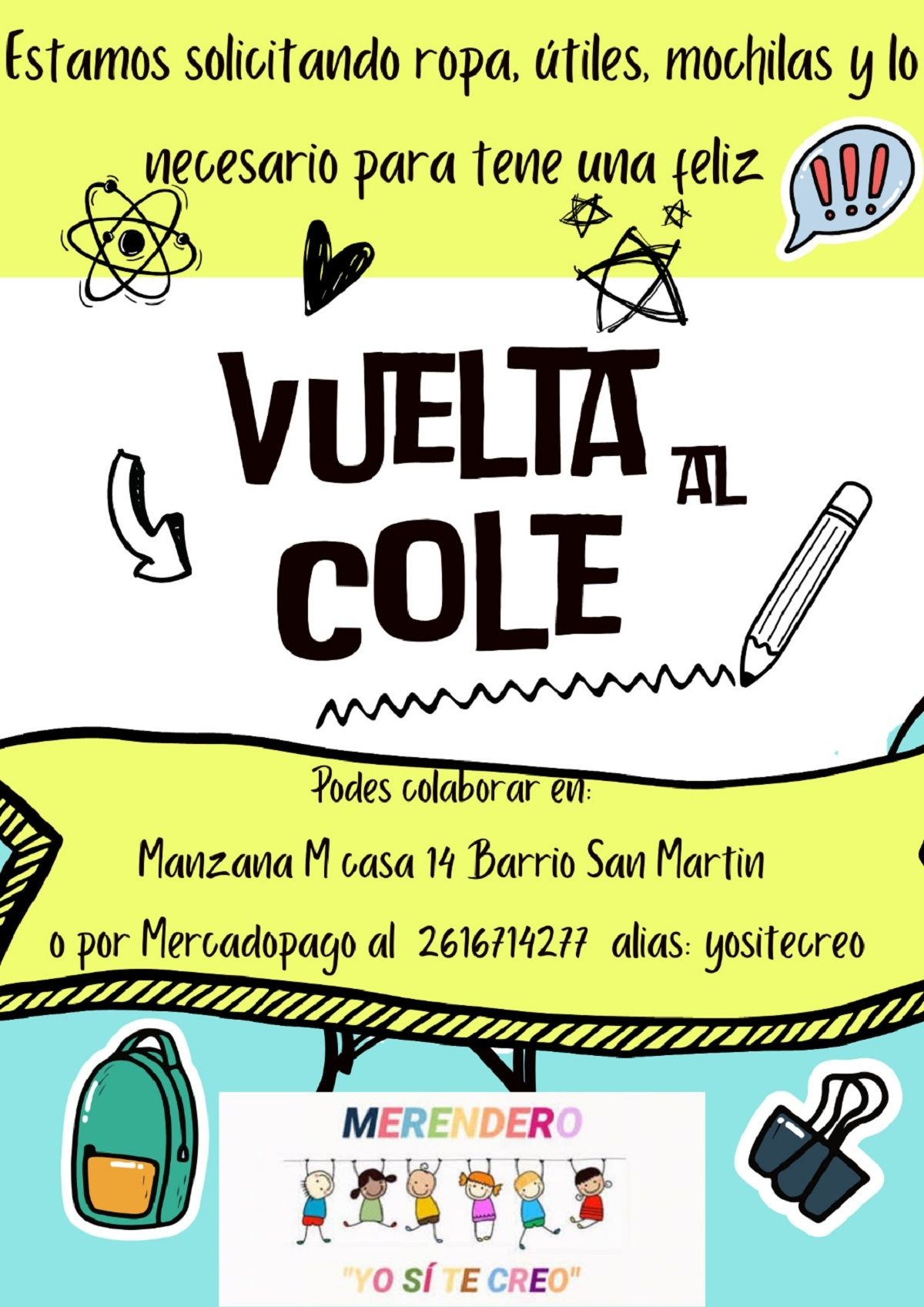 "Lo que más necesitan los niños del barrio son mochilas y zapatillas. Hay mucha pobreza y los precios están imposibles de costear para la mayoría de las familias en el barrio", cuenta Paola González, a cargo del merendero "Yo sí te Creo", ubicado en el barrio San Martín de Ciudad. Por estos días, desde esta entidad que colabora con cientos de familias, se encuentran en la realización de una campaña para llevar algo de tranquilidad a los niños y niñas y permitir que puedan iniciar las clases en breve.