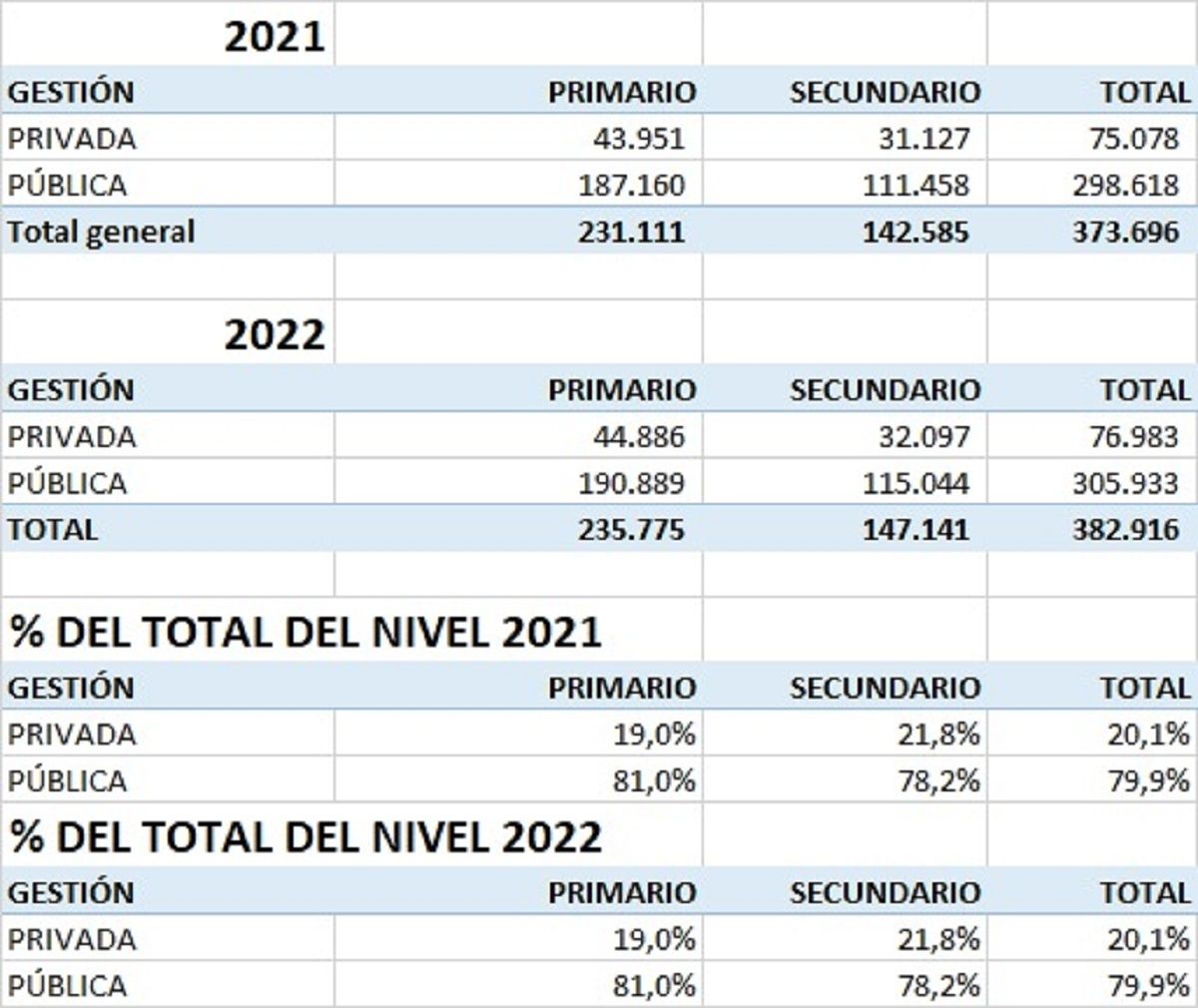 Así, mientras que en 2021 las escuelas de gestión pública (de los niveles primario y secundario) recibieron a un total de 298 mil 618 estudiantes, las privadas presentaron una matrícula total de 75.078 alumnos. En tanto que al año siguiente, esas cantidades fueron de 305 mil 933 y 76 mil estudiantes respectivamente.