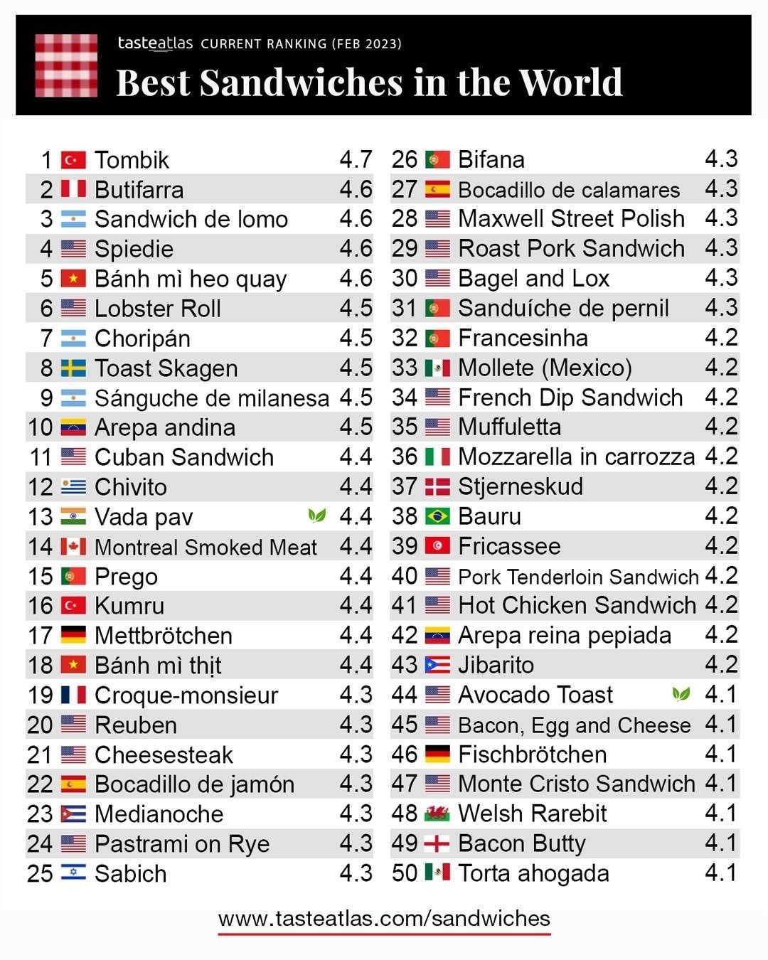 El ranking continúa con diversas variedades de sándwiches: el spiedie americano, el bánh mì heo quay de Taiwán, el lobster roll estadounidense y el clásico choripán argentino, que se encuentra en el puesto número 7.