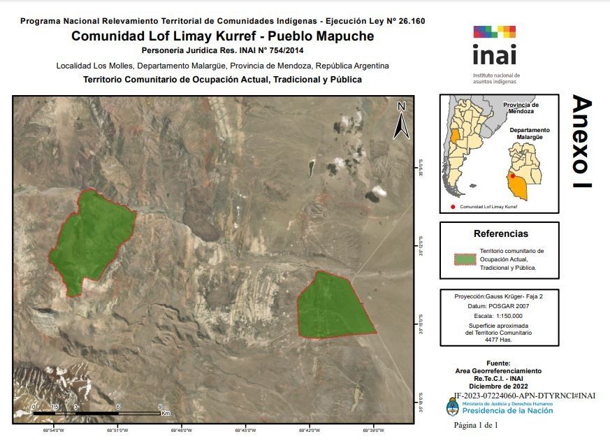 "Dése por cumplido el Relevamiento Técnico, Jurídico y Catastral dispuesto por el Artículo 3° de la Ley Nacional Nº 26.160, Decreto PEN N°1122/07 y la Resolución INAI N° 587/07 en la Comunidad Lof Limay Kurref, perteneciente al Pueblo Mapuche, con asiento en la provincia de Mendoza, con Personería Jurídica Nro. 754 del 06 de agosto de 2014 del Registro Nacional de Comunidades Indígenas Re.Na.C.I.", dice la resolución del INAI. "Reconócese la ocupación actual, tradicional y pública de la Comunidad Lof Limay Kurref, perteneciente al Pueblo Mapuche, con asiento en la provincia de Mendoza", agrega.