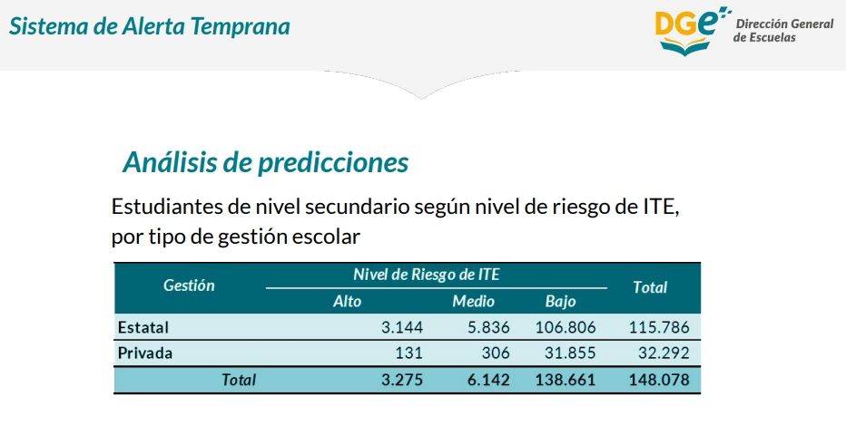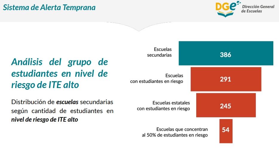 La investigación tuvo un corte en noviembre del 2022 y expresa que de un total de 148.978 estudiantes de escuelas secundarias de gestión pública y privada, 3.275 tienen un nivel alto de riesgo de Interrupción de Trayectoria Escolar (ITE) lo que equivale a un 55% del alumnado. Según el informe proporcionado por la DGE, un total de 6.142 estudiantes tienen riesgo de Interrupción de Trayectoria Escolar (ITE) medio y 138.661, es decir, menos del 20% es de ITE bajo.