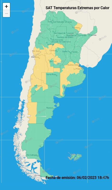 Según el reporte del organismo nacional, la advertencia por temperaturas extremas comprende la totalidad de la provincia de Mendoza, gran parte de Buenos Aires y San Luis; oeste de La Pampa, Río Negro, Chubut y Córdoba; sur San Juan y La Rioja; este de Formosa.