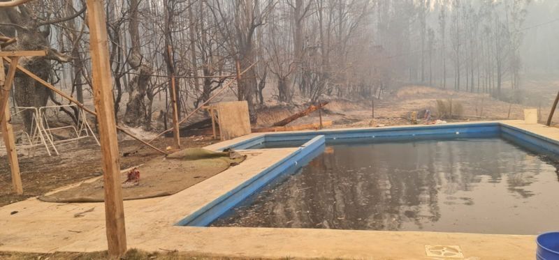 En esta piscina tuvieron que refugiarse siete personas -incluyendo dos menores- del devastador incendio en Santa Juana.